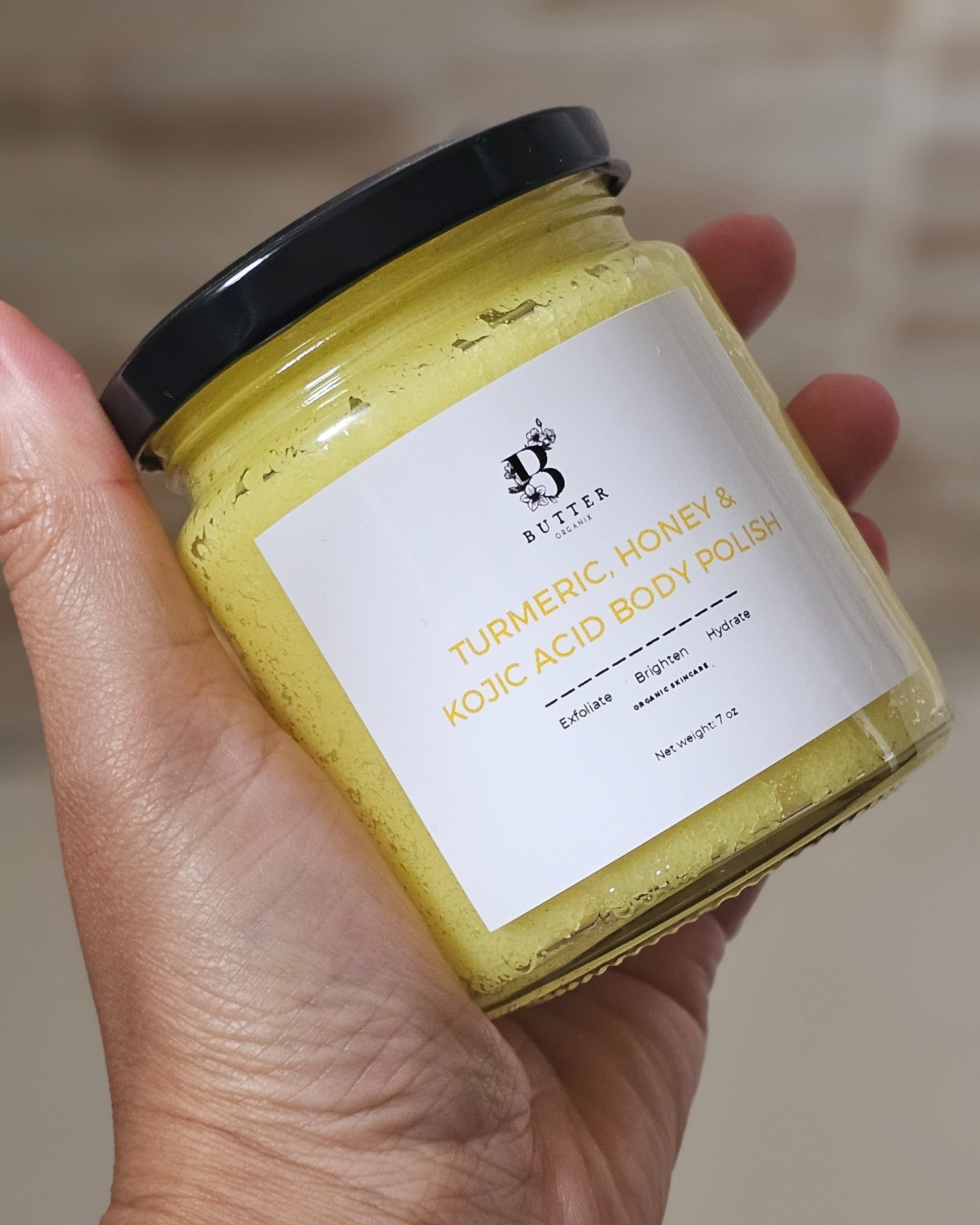Turmeric Honey and Kojic Acid Body Polish is a luxurious addition to any skincare routine. This nourishing scrub combines the brightening properties of turmeric and kojic acid with the hydrating and soothing qualities of organic honey.